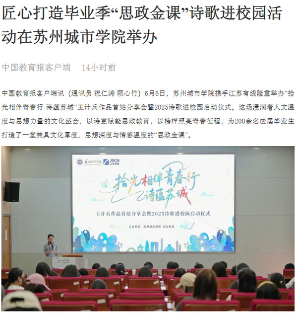 6月6日,苏州城市学院携手江苏有线隆重举办“拾光相伴青春行·诗蕴苏城”王计兵作品首站分享会暨2025诗歌进校园启动仪式。这场浸润着人文温度与思想力量的文化盛会,以诗意赋能思政教育,以榜样照亮青春征程,为200余名应届毕业生打造了一堂兼具文化厚度、思想深度与情感温度的“思政金课”。