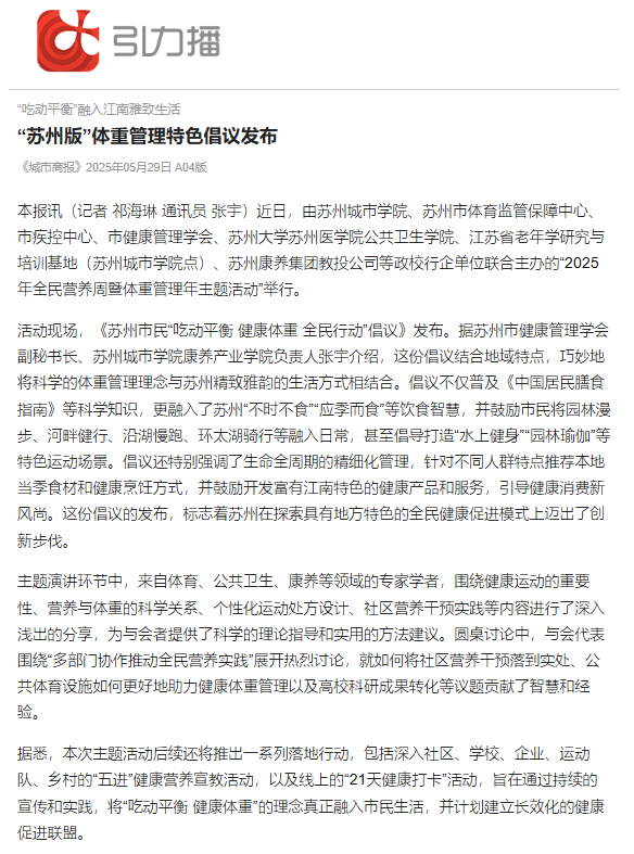 近日,由苏州城市学院、苏州市体育监管保障中心、市疾控中心、市健康管理学会、苏州大学苏州医学院公共卫生学院、江苏省老年学研究与培训基地(苏州城市学院点)、苏州康养集团教投公司等政校行企单位联合主办的“2025年全民营养周暨体重管理年主题活动”举行。