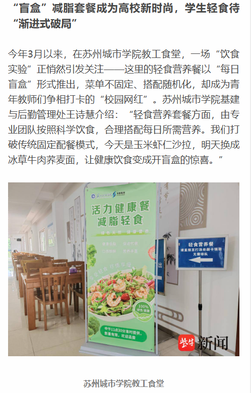 “大家喜爱的背后,同时也证明了一个道理,‘轻食风’健康与好吃兼得才能赢得大家的普遍青睐,这也对餐饮服务的创新提出了新的要求。既满足味蕾的挑剔,又守住健康底线。”张宇表示,苏州在健康膳食领域仍大有可为,医院、高校、社区可以进一步深化合作,引入中医食疗、运动营养等专业资源,让健康理念从食堂延伸到课堂、到百姓家中。