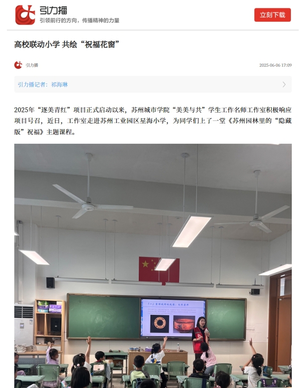 2025年“逐美青红”项目正式启动以来,苏州城市学院“美美与共”学生工作名师工作室积极响应项目号召,近日,工作室走进苏州工业园区星海小学,为同学们上了一堂《苏州园林里的“隐藏版”祝福》主题课程。