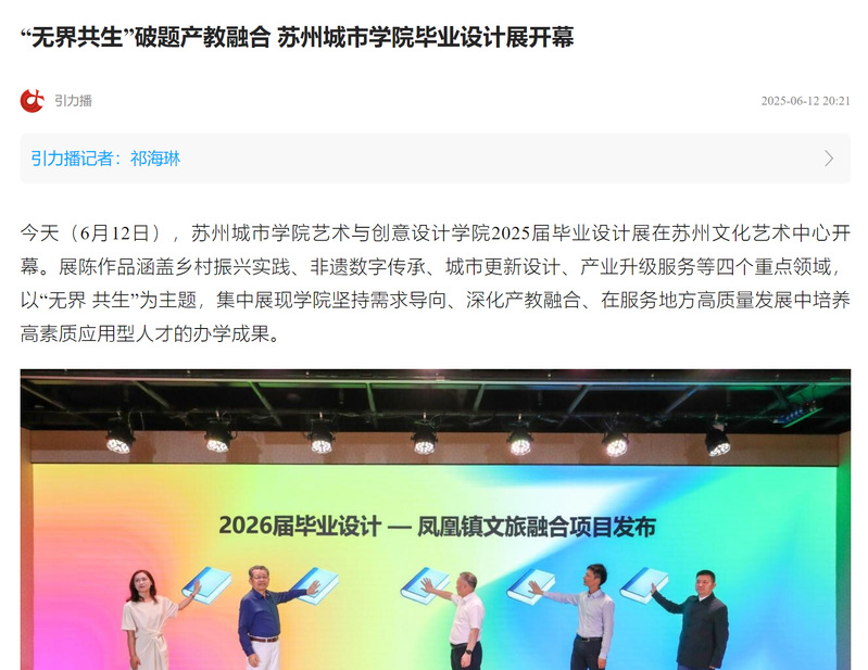 今天(6月12日),苏州城市学院艺术与创意设计学院2025届毕业设计展在苏州文化艺术中心开幕。展陈作品涵盖乡村振兴实践、非遗数字传承、城市更新设计、产业升级服务等四个重点领域,以“无界 共生”为主题,集中展现学院坚持需求导向、深化产教融合、在服务地方高质量发展中培养高素质应用型人才的办学成果。