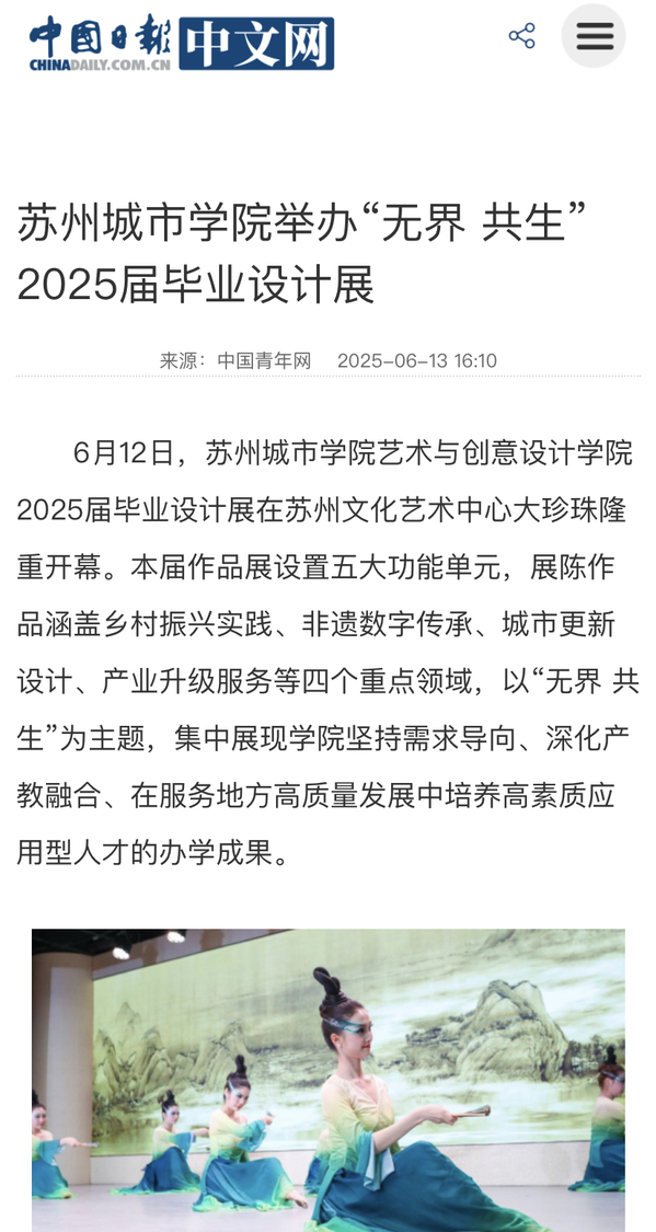 6月12日,苏州城市学院艺术与创意设计学院2025届毕业设计展在苏州文化艺术中心大珍珠隆重开幕。本届作品展设置五大功能单元,展陈作品涵盖乡村振兴实践、非遗数字传承、城市更新设计、产业升级服务等四个重点领域,以“无界 共生”为主题,集中展现学院坚持需求导向、深化产教融合、在服务地方高质量发展中培养高素质应用型人才的办学成果。