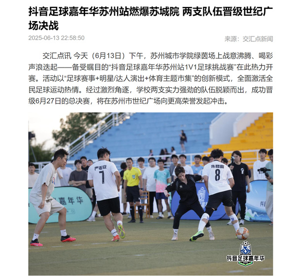 交汇点讯 今天(6月13日)下午,苏州城市学院绿茵场上战意沸腾、喝彩声浪迭起——备受瞩目的“抖音足球嘉年华苏州站1v1足球挑战赛”在此热力开赛。活动以“足球赛事 明星/达人演出 体育主题市集”的创新模式,全面激活全民足球运动热情。经过激烈角逐,学校两支实力强劲的队伍脱颖而出,成功晋级6月27日的总决赛,将在苏州市世纪广场向更高荣誉发起冲击。
