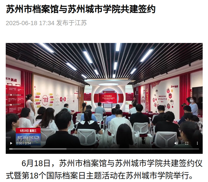 6月18日,苏州市档案馆与苏州城市学院共建签约仪式暨第18个国际档案日主题活动在苏州城市学院举行。