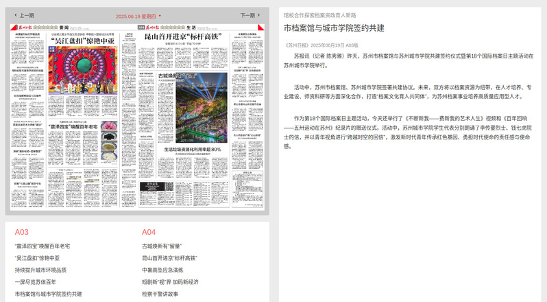 6月18日,苏州市档案馆与苏州城市学院共建签约仪式暨第18个国际档案日主题活动在苏州城市学院举行。