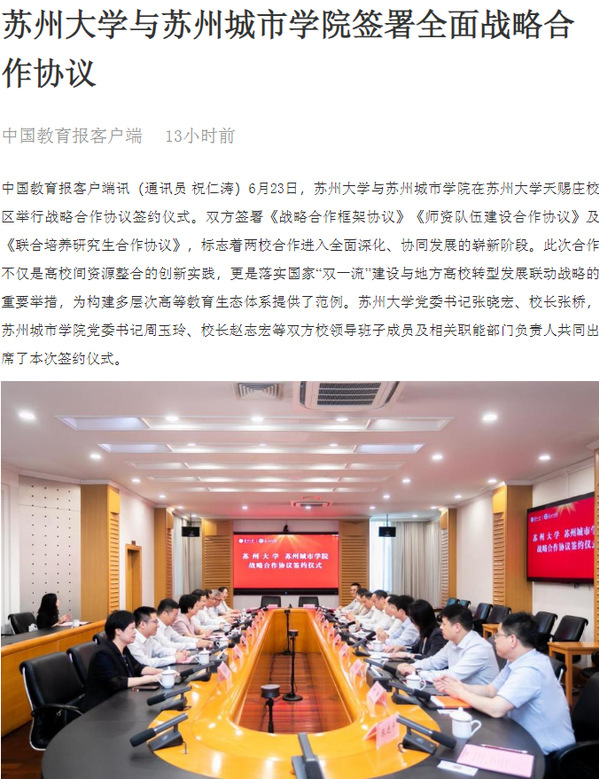 6月23日,苏州大学与苏州城市学院在苏州大学天赐庄校区举行战略合作协议签约仪式。双方签署《战略合作框架协议》《师资队伍建设合作协议》及《联合培养研究生合作协议》,标志着两校合作进入全面深化、协同发展的崭新阶段。此次合作不仅是高校间资源整合的创新实践,更是落实国家“双一流”建设与地方高校转型发展联动战略的重要举措,为构建多层次高等教育生态体系提供了范例。苏州大学党委书记张晓宏、校长张桥,苏州城市学院党委书记周玉玲、校长赵志宏等双方校领导班子成员及相关职能部门负责人共同出席了本次签约仪式。