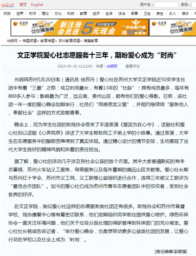 在文正学院,类似爱心社这样的志愿服务类社团还有很多。助残协会和苏州市盲聋学校、残协康复中心等有着密切联系,他们定期组织同学前往提供爱心陪护。绿色环保协会一直关注环境问题,他们关于垃圾分类处理的调研曾得到环保部门的充分肯定。爱心社社长杨斌告诉记者,“举办爱心晚会,也是想带动更多公益类社团的发展,让爱心行动在学校以及社会上成为‘时尚’。”
