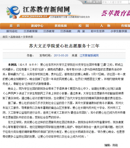 在文正学院,类似爱心社这样的志愿服务类社团还有很多。助残协会和苏州市盲聋学校、残协康复中心等有着密切联系,他们定期组织同学前往提供爱心陪护。绿色环保协会一直关注环境问题,他们关于垃圾分类处理的调研曾得到环保部门的充分肯定。爱心社社长杨斌告诉记者,“举办爱心晚会,也是想带动更多公益类社团的发展,让爱心行动在学校以及社会上成为‘时尚’。”