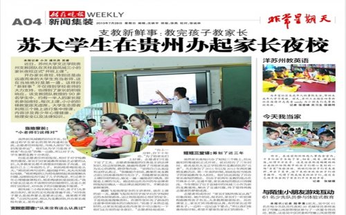 虽然家长夜校只办了短短三个晚上,但从最初的筹建到正式开班,前后经历了三年时间。俞炎是苏大文正学院贵州支教团队的“元老”,先后参加了2011年以及2012年两次暑期支教活动。第一年来的时候,他就发现当地孩子的家庭教育令人担忧。他们由此萌发了开办家长夜校的想法。但由于前两年支教的地点在竹林乡小学,交通不便,家长夜校的想法只得搁浅。今年增加了位于县城中的凤城三小作为新的支教基地,解决了交通问题,终于使得两拨志愿者的梦想成真。