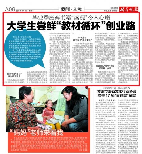 三年前,腾远公司在苏大文正学院的大学生创业园内起步。因为有着学校提供的免费场地以及启动资金,所以公司的创建并不困难。虽然一开始他们就把经营理念定为“绿色、环保”,但真正让他们萌发教材循环利用念头的却是2008年毕业季宿舍楼下的“盛况”——其实这样的场景在绝大多数大学都会出现,那就是数量众多的废弃书籍。