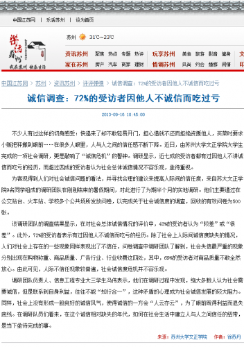 为客观得到人们对社会诚信问题的看法,并寻找合理的建议来提高人际间的信任度,来自苏大文正学院9名同学组成的调研团队在刚刚结束的暑假期间,对此进行了为期半个月的实地调研。他们主要通过在公交站台、火车站、学校多个公共场所发放问卷,以完成关于社会诚信度的调查,回收的有效问卷为500张。