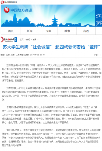 为客观得到人们对社会诚信问题的看法,并寻找合理的建议来提高人际间的信任度,来自苏大文正学院9名同学组成的调研团队在刚刚结束的暑假期间,对此进行了为期半个月的实地调研。他们主要通过在公交站台、火车站、学校多个公共场所发放问卷,以完成关于社会诚信度的调查,回收的有效问卷为500张。