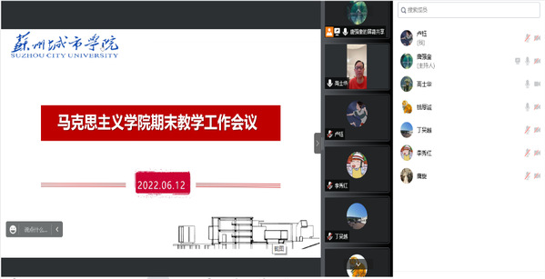 6月12日下午,为顺利做好期末教学工作和开展好暑假社会实践教学活动,马克思主义学院召开期末教学工作线上会议。学院教务负责人、《毛泽东思想和中国特色社会主义理论体系概论》课程负责人唐强奎,《形势与政策》课程负责人丁良超,《马克思主义基本原理概论》课程负责人钱厚诚,《思想道德与法治》课程负责人唐旋,《近现代史纲要》课程负责人李秀红及教务助理卢钰出席会议,会议由院长高士华主持。