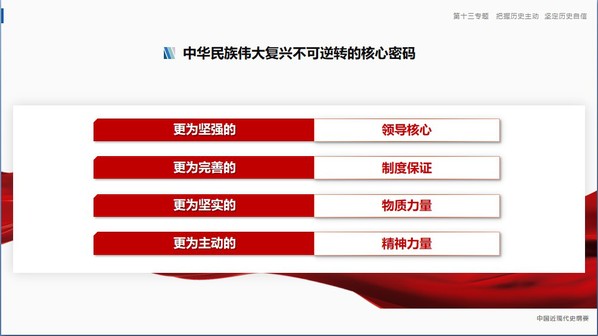 李秀红从四川省凉山彝族自治州的阿土列尔村又被称为“悬崖村”的故事入手,从我们有了更为坚强的领导核心、更为完善的制度保证、更为坚实的物质力量、更为主动的精神力量四个方面展开讲授中华民族伟大复兴的核心密码。在课程最后,引发当代大学生思考作为新时代青年,应当如何肩负起实现中华民族伟大复兴的历史使命,使青年大学生更加明确自己的使命、责任和担当,用汗水浇灌青春之花。