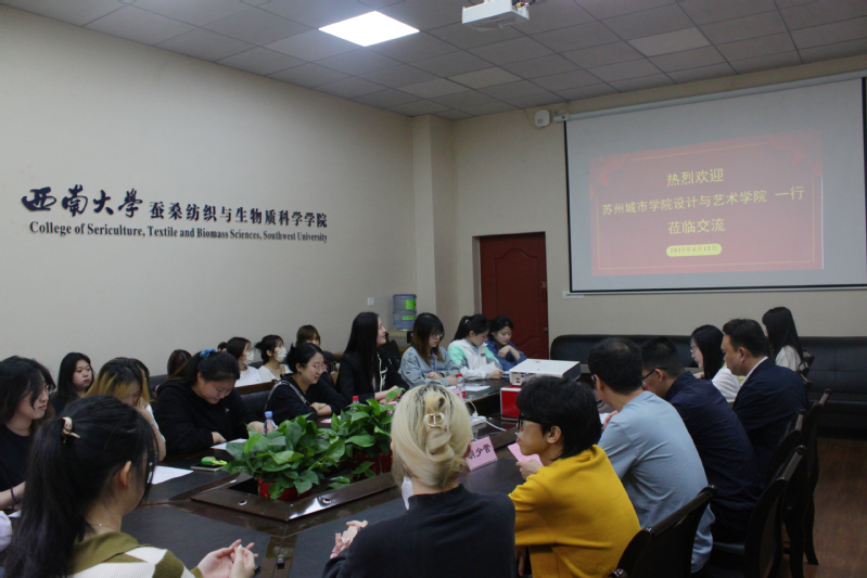 考察期间,师生们一同前往西南大学进行学术交流。西南大学蚕桑纺织与生物物质学院副院长蓝广芊,教授张龙琳、胡少营,专任教师冯雨雪对学院一行表示欢迎,并介绍了西南大学及学科专业概况。双方就基本概况、学科建设发展、课程设置等方面进行了深入交流与热烈讨论。通过这次学术交流活动,增进了双方学校、专业的了解,为进一步合作交流打下了良好的基础。