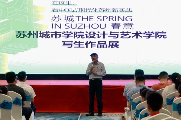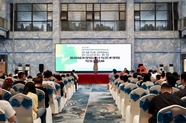 6月13日下午,“苏城春意”——苏州城市学院设计与艺术学院写生作品展在苏州国际艺术大酒店展厅开幕。展览以“在这里,看中国式现代化苏州新实践”为主题,展出作品以学生的写生作品为主,同时推出教学改革成果,融合写生基地风土人情以及水乡文化元素的设计文化旅游创意作业。出席开幕式的嘉宾有吴中区文化体育和旅游局四级调研员谢中泰,吴中区文化体育和旅游局产业科科长窦旸,甪直镇文体中心副主任朱燕君,甪直镇鸿运社区负责人费翔,苏州人民教育出版社附属实验小学校长沈赟峰。参加此次活动的还有吴中区企业代表和设计与艺术学院的师生代表,开幕式由设计与艺术学院专业教师王小萌主持。