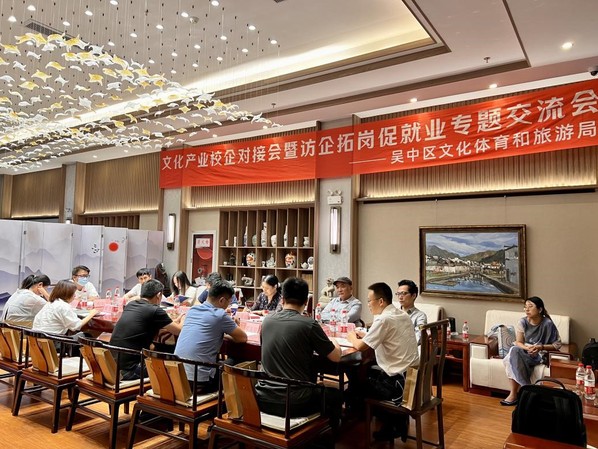 当天下午,在现场举行了吴中区文化产业校企对接会暨访企拓岗促就业专题交流会。教务处处长施盛威介绍了学校专业设置情况,并从立德树人理念、合作育人方式、产教融合路径、苏州文化品牌以及组织保障等方面提出了建议,期待与吴中区文化体育和旅游局及各文化类企业开展更为密切的基地共建和人才培养工作。吴中电竞产业园、苏州腾麟影视有限公司、苏州飞马良子影视有限公司等企业代表介绍了企业发展情况和人才需求。最后,谢中泰介绍了吴中区文化产业发展情况并做交流会总结。