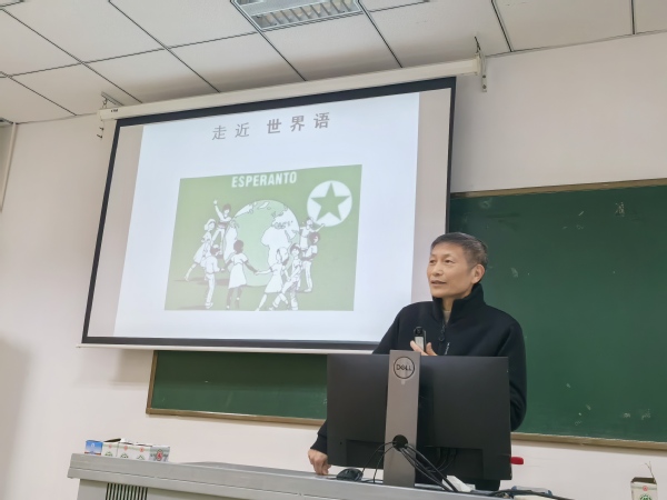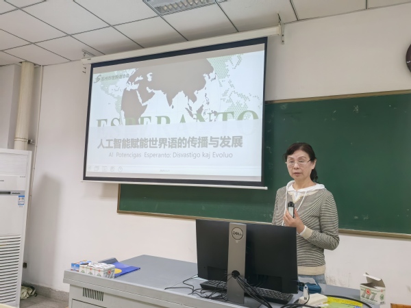 活动伊始,宋丽莉会长以“世界语:跨越文明的纽带”为主题展开演讲。她结合苏州市世界语协会近年来在苏州景范中学等地的推广经验,系统介绍了世界语的起源、语言特性及其“中立、平等、和平”的核心理念。她特别提到,苏州作为吴文化发源地,近年来通过“行走的思政课”等创新形式,将范仲淹“忧乐精神”与世界语倡导的“人类命运共同体”理念相融合,形成了独具特色的文化传播路径。宋会长还展望了协会与高校的合作方向,提出“依托机器翻译技术拓展世界语应用场景”的建议,引发学子对语言科技与人文价值的深度思考。