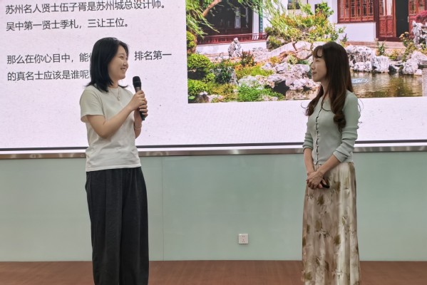 讲座开场,月月姐姐以童年在沧浪亭数花窗的记忆为引,分享不同时期对这座园林的感悟,迅速拉近与师生的距离,点燃探索苏州历史文化的热情。随后,她依历史脉络,生动讲述苏州古今。从季札谦逊让国、阖闾与伍子胥强吴,到三国孙策周瑜风云际会;从陆机奠定文脉根基,到唐代白居易、刘禹锡等诗人刺史引领诗风,再到张继《枫桥夜泊》引发千年热议;从范仲淹兴办府学、苏轼留下风雅故事,到范成大出使金国、著《吴郡志》存史。期间,她用苏州方言讲解盘门、阊门等城门文化,现场演绎昆曲《牡丹亭》水磨调,吴音软糯、唱腔婉转,将氛围推向高潮。互动环节,她以“心中的苏州名人”为题,引导学生客观评价历史人物,还分享了历史文化短视频创作心得。最后,月月姐姐鼓励大家走出校园,阅读城市,探寻文化古迹背后的深厚底蕴。