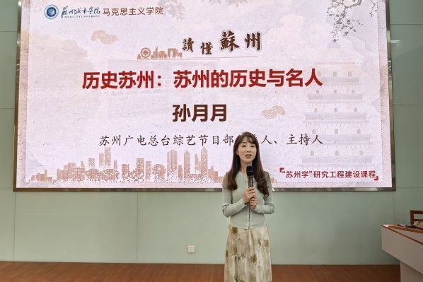 2025年4月16日下午,《读懂苏州》系列讲座第四讲“历史苏州”在苏州城市学院教学楼2-101教室拉开帷幕。此次讲座特邀苏州广电总台综艺节目部主持人、融媒读书节目《月月书房》主理人孙月月作为嘉宾,为全校师生带来一场关于苏州历史与名人的文化盛宴。讲座由马克思主义学院杨海华教授主持。