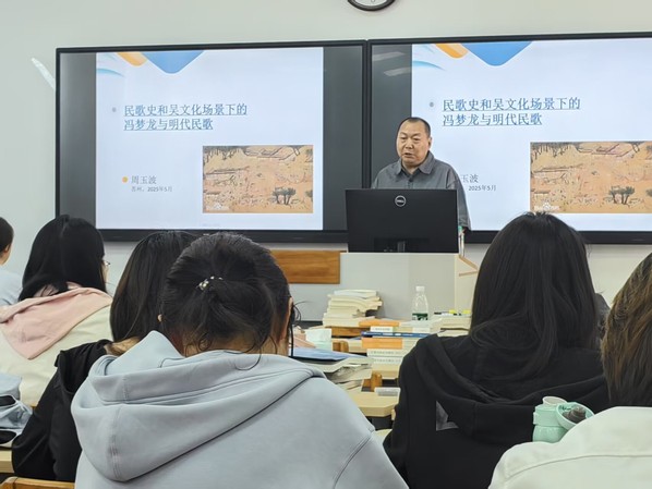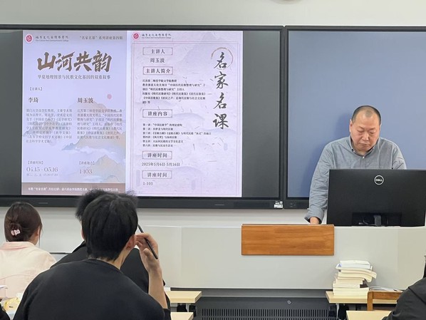 为深入贯彻落实新时代新文科教育发展要求,推进学科价值重构与范式创新,2025年5月6日至5月16日,城市文化与传播学院第四期“名家名课”系列讲座下半场圆满举行。本场讲座特邀江苏第二师范学院文学院周玉波教授以“山河共韵——华夏地理图景与民歌文化基因的双重叙事”为核心主题,立足中国民歌文化研究,为23级书院文科基地班学生带来了一场精彩的学术盛宴。