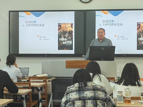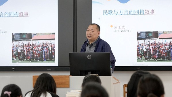 讲座过程中,周玉波教授以深厚的学术底蕴,聚焦苏州地域文化特色,引领同学们深入品鉴吴歌艺术精品。通过其生动详实的讲解,同学们深刻体悟到吴歌不仅是吴地文化的瑰宝,更是江南文脉的重要载体,在中华优秀传统文化谱系中占据着不可替代的地位。周教授更以其学术人生为典范,殷切寄语在场学子,期盼民歌艺术的种子能在青年一代的心田生根发芽,绽放出传承与创新的文化之花。