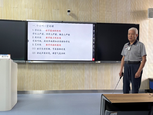 戴苏明围绕什么叫一堂好课、完成上课的三个环节以及好课的内涵体现展开讲座。针对如何上好一门课,戴苏明从备课、讲课和治课三个环节提出了许多宝贵的建议。例如在备课环节,教师要能以教学大纲为基,认真撰写教案,精心准备课件。同时,根据专业要求,结合现代科学技术和文化的发展对教材内容进行分割、调整、删减与补充;在讲课环节,教师要能做到条理清楚、重点突出、启发引导、深入浅出、语言生动和互动分享;在治课环节,教师要能做到了解学生、严格要求、把控课堂、自我展现和热爱学生。