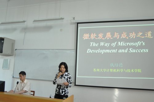 作为苏州大学计算机应用专业的博士生导师,钱培德教授是中国著名中文信息处理技术专家、国家级有突出贡献中青年专家、国务院政府特殊津贴享受者。他通过多媒体设备,向学生们图文并茂地讲述了微软的发展史及其成功之道。钱教授幽默风趣的演讲风格给在场的每一位学生都留下了深刻的印象。