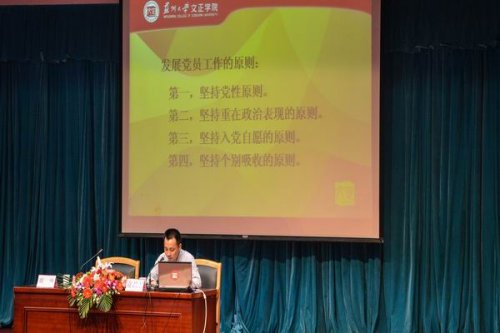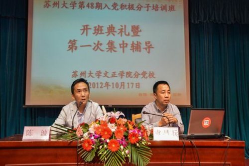 10月17日下午4点,苏州大学文正学院第48期入党积极分子培训开班典礼暨第一次讲座在我院学术报告厅举行。本期开班典礼由我院思想政治教育中心主任陈波老师主持,院长助理袁昌兵老师作了题为“发展党员工作程序与需求”的讲座。