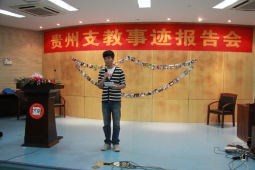 会场随处可见的支教照片记录了两个贵州支教团队一路行进的足迹,会议开始,“2012爱·黔行贵州支教团队”和“2012文正爱心支教团队”两段感人视频的播放,则展现了支教过程的酸甜苦辣。