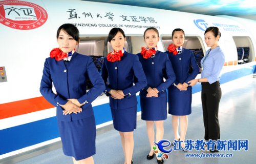 作为江苏省内第二所开设空乘本科专业的学校,苏大文正学院的空乘专业虽然才开设了一年,但是却拥有模拟客舱、化妆训练室、形体训练室、机模陈列室和cbt教学软件等国内外先进的专业教学设施设备。与硬件相比,该学院全新的空乘人才培养体系更让人耳目一新。殷爱荪表示:“我们要培养学生的专业以及职业的神圣感、荣誉感以及神秘感,并把这一职业当作一份事业去追求”。