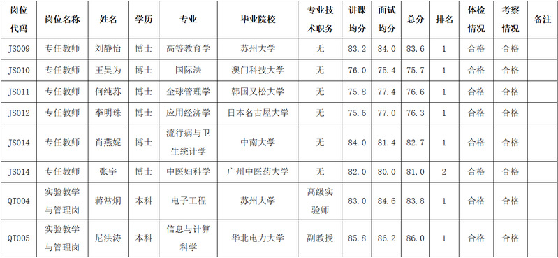 根据《苏州城市学院2024年度下半年高层次火狐体育的人才招聘公告》,经过试讲、面试考核、资格复审、心理测试、体检、政审等程序,拟录用以下8名同志,现公示如下: