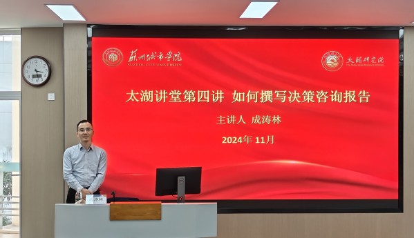 为深入学习贯彻习近平生态文明思想和习近平总书记关于太湖治理工作的重要指示批示精神,进一步提高我校教师决策咨询研究水平,更好地服务苏州经济社会发展,11月4日下午,太湖研究院(筹)、文正智库特邀市政府研究室科研处成涛林处长作题为“如何撰写决策咨询报告”的专题讲座。太湖研究院(筹)副院长陈璇主持讲座,太湖研究院(筹)、文正智库全体人员、各学院(部)的教师代表共30余人参加了讲座。