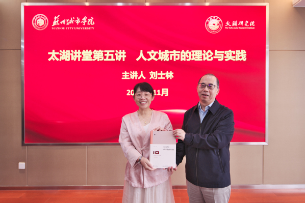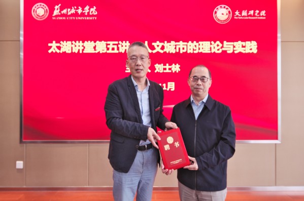 黄涧秋向刘士林教授颁发苏州城市学院太湖研究院(筹)特聘研究员证书。随后,刘士林教授向研究院赠送了他的新作《新兴人文城市的景德镇样本》。