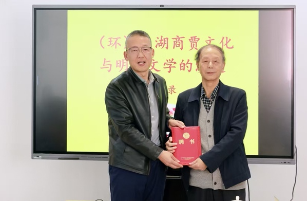 黄涧秋对陈书录教授的到来表示热烈欢迎,并向陈书录教授颁发苏州城市学院太湖研究院(筹)特聘研究员证书。随后,陈书录教授向研究院赠送了他的代表作《明代诗文的演变》。