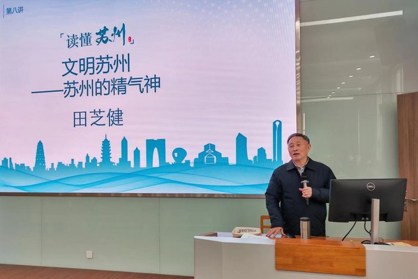 12月18日下午,《读懂苏州》专题八“文明苏州”在苏州城市学院教学楼2-101开讲。苏州城市学院马克思主义学院院长,苏州大学马克思主义学院教授、博士生导师田芝健作“文明苏州——苏州的精气神”专题讲座。本次讲座由马克思主义学院杨海华教授主持。